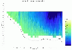 Alle Langzeitmessstationen liegen aus Sicherheitsgründen deutlich außerhalb der tiefen Fahrrinne, im Falle der LZ2 sogar weit außerhalb ohne Anbindung an die Hauptrinne. Aus diesem Grunde können die höheren Strömungsgeschwindigkeiten in den Fahrrinnen nicht kontinuierlich erfasst werden. So werden mit sporadischen Messungen wegen der sehr hohen Variabilität der Strömungen hier tägliche, monatliche oder jährliche Vergleiche mit den Verhältnissen in der Hauptrinne der Elbe unmöglich sein. Aus diesem Grunde werden verstärkt ADCP (AcousticDopplerCurrentProfiler) Messungen im Querprofil über die Fahrrinne durchgeführt um zumindest Veränderungen in der Strömungsverteilung im Querprofil zu erfassen und in Verbindung mit Langzeitmessungen im Profil auch auf langfristige Änderungen schließen zu können, wenn sie denn vorhanden sind. Die Messung im Profil an der LZ1 Krummendeich ist Bestandteil dieses Beweissicherungsberichtes und folgender Berichte. Mit dem ADCP kann die Strömung in einem Querschnitt nahezu vollständig - jedenfalls dort wo das Messschiff fahren kann - erfasst werden in vertikaler und horizontaler Ausbreitung. Üblicherweise wird ein Querprofil über die Dauer einer gesamten Tide immer wieder abgefahren. Die Abbildungen II.1.3.2-9 und II.1.3.2-10 zeigen farbkodiert die Beträge der Geschwindigkeiten zum Zeitpunkt der stärksten Flut (gelb/rot) bzw. Ebbe (grün/blau) im Querprofil, das von Süd (i. d. Abb. links) nach Nord verläuft.